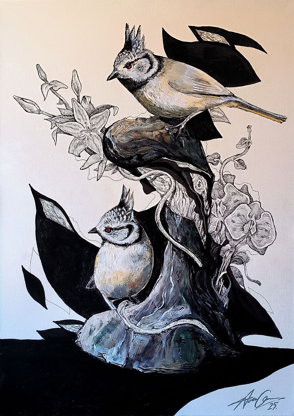 Andrés Gomez Oballe ist ein 1999 in Madrid geborener Künstler, dessen Werk detaillierten Realismus mit abstrakten und ausdrucksstarken Elementen verbindet. Schon in jungen Jahren zeigte er eine Faszination für die Natur und wie Kunst ihre Schönheit und Dynamik einfangen kann. Beeinflusst vom Kontrast zwischen dem städtischen Leben Madrids und der Natur, die er während seiner Kindheit besuchte, kombiniert sein Stil Präzision und Spontaneität in Räumen mit sorgfältig wiedergegebenen Motiven – wie Vögeln und Pflanzen – umgeben von locker skizzierten, fließenden Hintergründen.